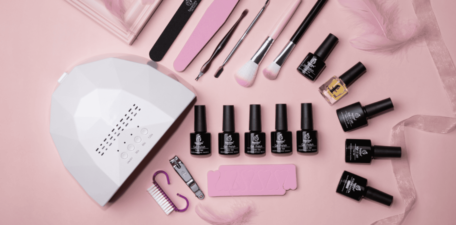 Este kit de esmaltes para uñas en gel incluye el secador de uñas con luz LED marca Bettles, todas las herramientas y limas para hacer la manicura paso a paso y un juego completo de esmaltes de uñas de gel marca Beetles en blanco, variedad de rosados y glitter. Es un kit TODO EN UNO donde obtienes todo lo que necesitas para empezar a hacerte las uñas tú misma en la comodidad de tu hogar.